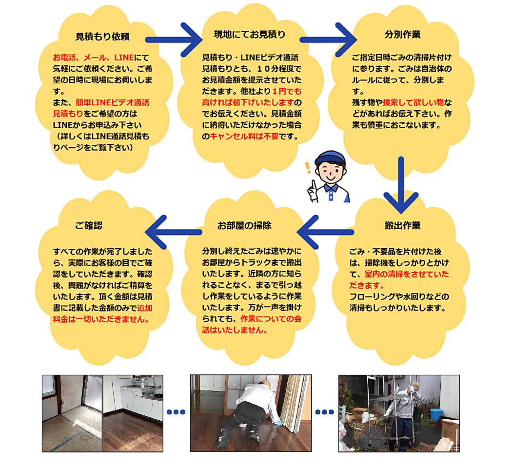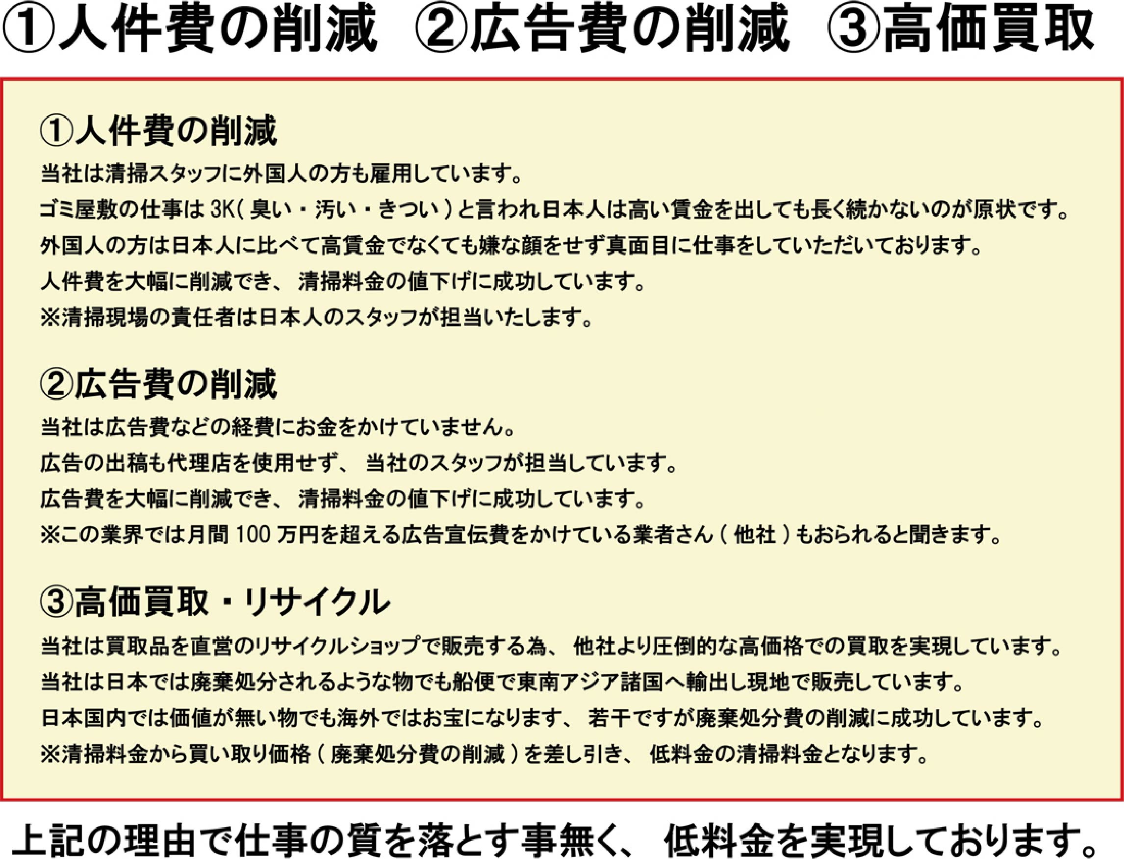 私どもは『ゴミ屋敷の片付けと汚部屋の清掃を専門』としている清掃業者です。当社の最大の売りは他社と比べて『お値段が安い』のと『どこにも負けない丁寧な仕事』です。